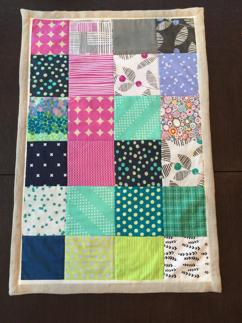 This was a fun little project. Since the fabric selection was a bit random, I enlisted help from my boys. First I set it all out. Then Oscar needed time to sleep on it and shove all the pieces onto the floor. My boy picked it all up, then helped design the layout with Dad’s help. Finally, when it was all complete, Felix blessed it with a nap.